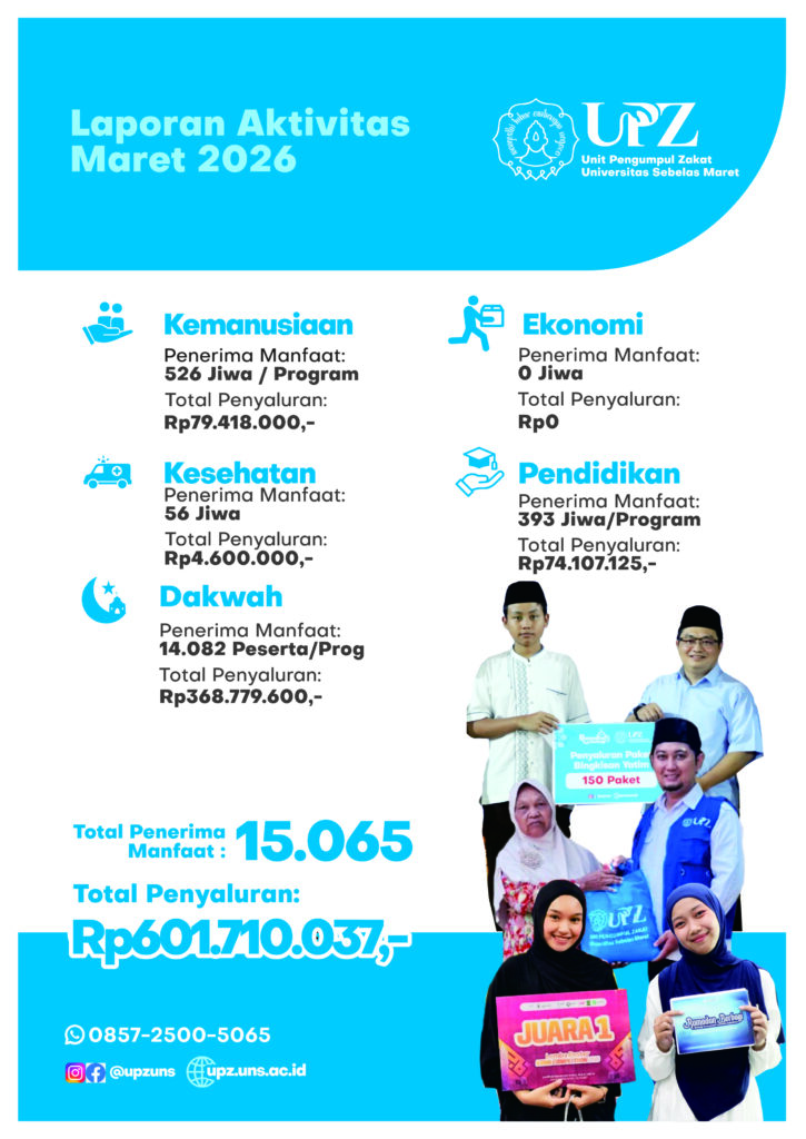 Capaian Maret 2026 ini menjadi bukti bahwa ketika kampus dan masyarakat bergerak bersama, zakat dan infak tidak hanya menjadi instrumen ibadah, tetapi juga solusi sosial yang nyata. UPZ UNS berkomitmen untuk terus menghadirkan program yang berdampak, berkelanjutan, dan semakin dekat dengan kebutuhan umat.