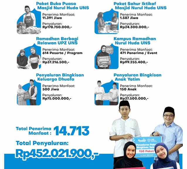 Dari sisi penyaluran, UPZ UNS menyalurkan dana sebesar Rp601.710.037 atau 95% dari total penghimpunan, dengan total 15.065 penerima manfaat. Angka ini bukan sekadar statistik—ia adalah representasi dari ribuan cerita yang hidup selama Ramadhan.